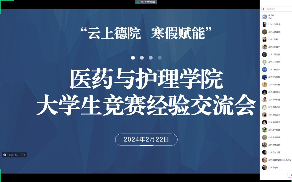 为提高学生竞赛意识和水平,2月22日下午,医药与护理学院于腾讯会议举办“云上德院,寒假赋能”2022级本科竞赛交流会。2022级近260名学生参加。
