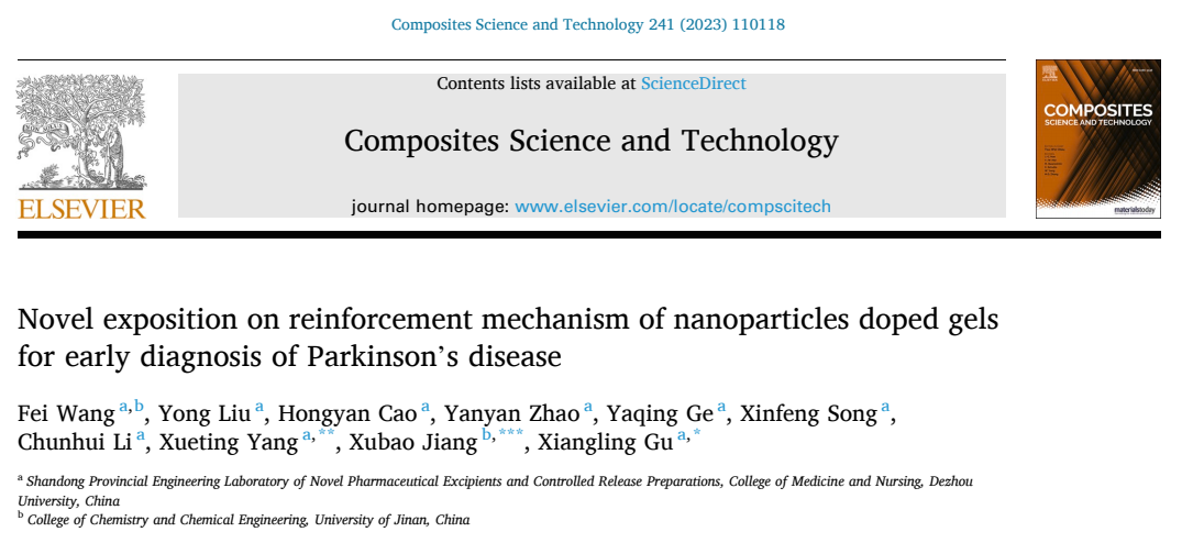 近日,医护学院药辅团队顾相伶课题组,依托新型药物辅料和缓控释制剂山东省工程研究中心,在帕金森疾病早期诊断医用凝胶的作用机制研究中取得最新成果。该课题组将聚苯胺纳米粒子(PANI NPs)掺杂到高分子水凝胶中,基于凝胶网络中的氢键及苯环间的疏水缔合作用的叠加效应,实现了凝胶力学和导电性能的增强。所制得的复合水凝胶在帕金森疾病的早期检测中具有潜在的价值。相关研究成果以英国365集团公司为第一单位,“Novel exposition on reinforcement mechanism of nanoparticles doped gels for early diagnosis of parkinson's disease”为题发表在国际期刊《Composites Science and Technology》(中科院一区,IF=9.879)。