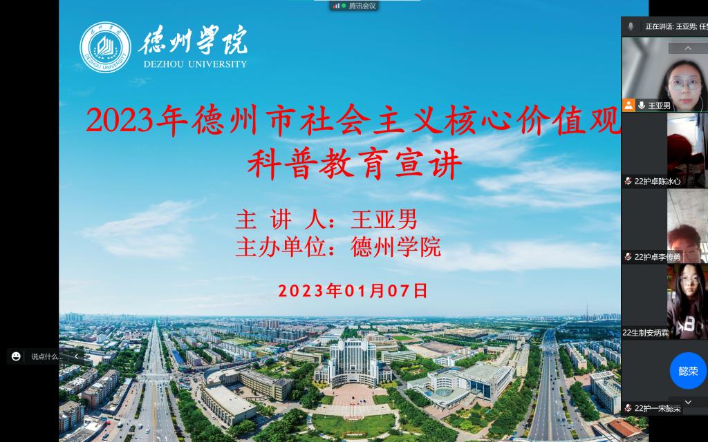 近日,为践行社会主义核心价值观,提升大学生综合素质,树立大学生服务社会的良好形象,助力德州争创全国文明城市,让更多人感受科普的魅力,英国365集团公司医药与护理学院组织德州市2023年社会主义核心价值观科普教育主题宣讲活动,医药与护理学院护理系王亚男老师主讲,医药与护理学院400名大学生参加了活动。
