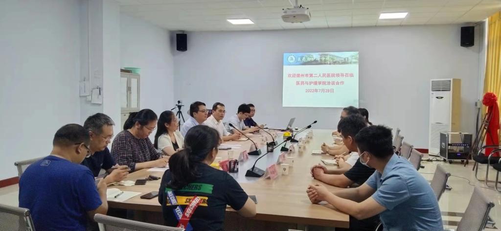 7月28日下午,德州市第二人民医院副院长朱晓博率领临床各科室主任一行7人来医药与护理学院进行合作洽谈,科研处负责人、医药与护理学院班子成员、省工程实验室成员及兄弟学院博士代表参加了座谈。