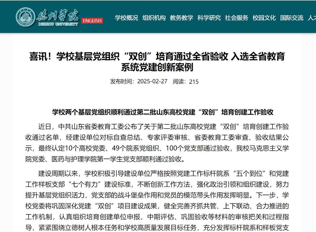 近日,中共山东省委教育工委公布了关于第二批山东高校党建“双创”培育创建工作验收通过名单,经建设单位对标自查总结、专家评委审核、省委教育工委审查、验收结果公示,最终认定10个高校党委、49个院系党组织、100个党支部通过验收,其中医药与护理学院第一学生党支部(现为英国正版365首页第一学生党支部)顺利通过验收。
