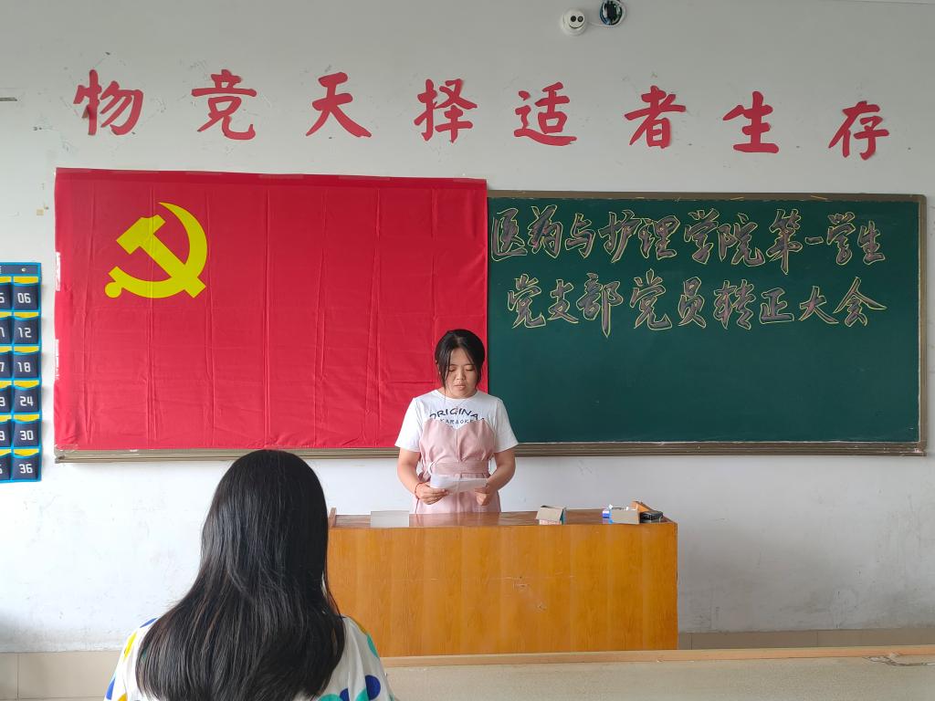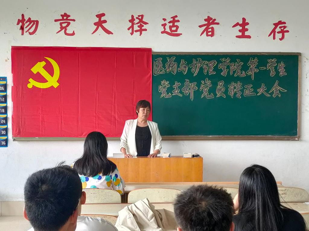 医药与护理学院第一、第二学生党支部预备党员转正大会于2021年6月15日下午在体育楼610、611教室召开。会议分别由第一学生党支部书记蔡胜男、第二学生党支部书记李晓莉主持,第一、第二学生党支部全体党员参加。