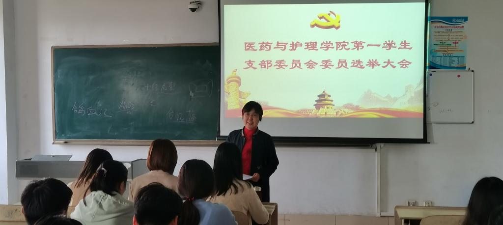 2021年4月27 日下午,医药与护理学院第一学生党支部在体育楼503教室举行委员会委员选举大会。会议由医药与护理学院党总支副书记孟爱青主持,组织员和全体学生党员参加。