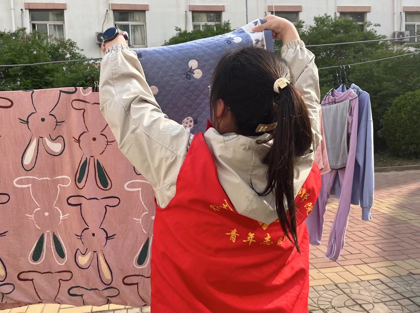活动内容主要是志愿者在宿舍楼公共晾衣区为同学们捡起掉落的衣服。这一简单举动,不仅培养了同学们的互助精神,增强大家关心他人、帮助他人的意识,还提升了同学们的责任感,让他们学会关注身边小事,积极为他人排忧解难,传递关爱与温暖,增强同学之间的凝聚力。