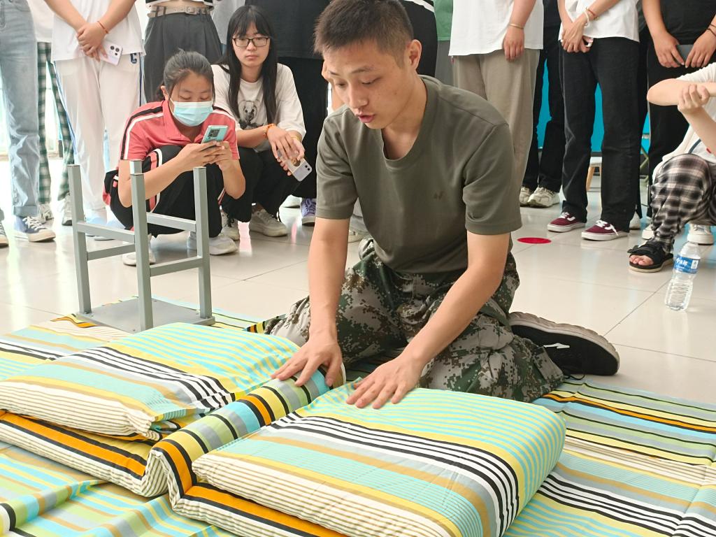 教官前往学生宿舍为同学们展示军被的正确叠法,并向他们详细讲述军训期间内务整理标准。教官一边示范一边讲解,从压被子开始,到被子的对折、折叠手法、掏平压实和如何跌出棱角等方面做了详细的示范的讲解。看着一床蓬松的被子就在简单的“叠、压、捋”几个动作之下,变成了四四方方的“豆腐块”。同学们积极实践练习,一床床有棱有角的被子开始被整齐地摆放在床头上。