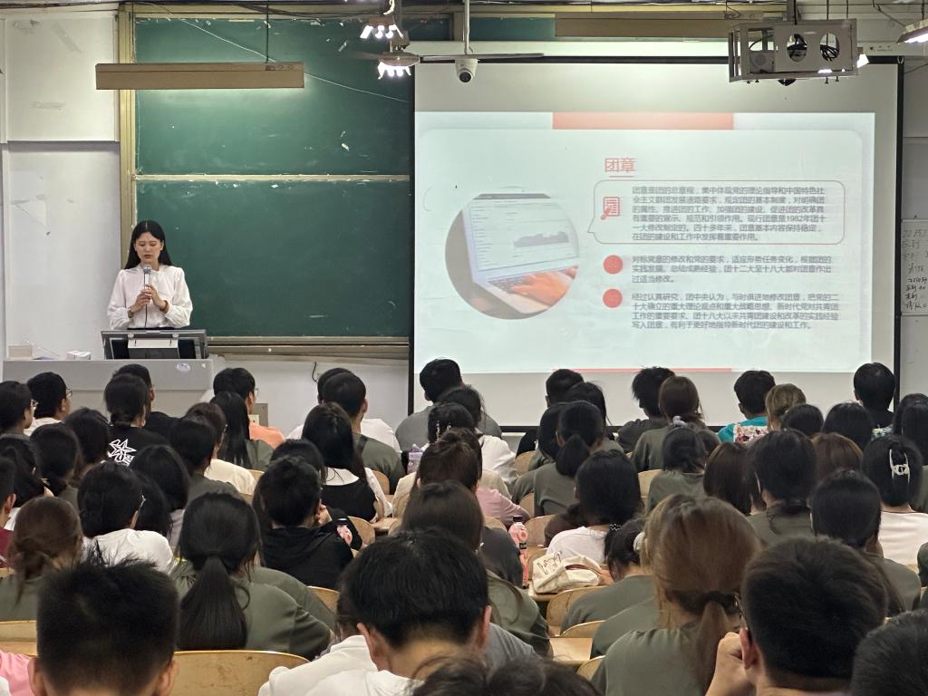 课堂上,老师组织新生学习团史团情团务,坚持政治教育与实践教育相结合,加强团员意识教育,增强团员身份认同感、自豪感和对组织的归属感。课堂上老师给大家详细讲解了“第二课堂成绩单”制度解读,引导新生在保证专业学习的前提下,结合个人兴趣爱好和发展方向,积极参加第二课堂教育活动,丰富大学生活,提升实践能力和综合素质。蔡老师以“举止文明、课堂文明、宿舍文明、就餐文明”为出发点,引导学生强化文明意识,营造文明氛围,树立公德意识,教育学生自觉遵守国家、社会、学校的各项法律、法规,做文明守纪大学生。