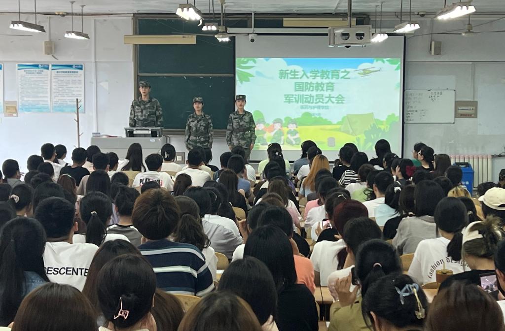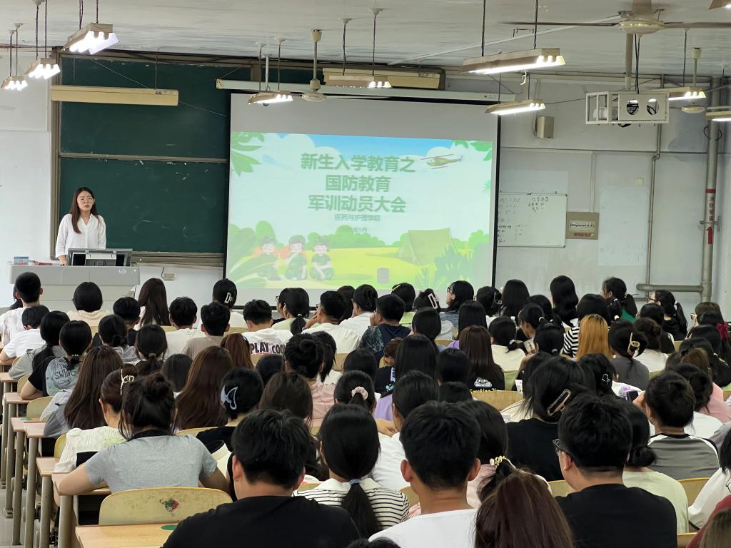 为贯彻落实党的二十大精神和习近平总书记系列重要讲话精神,引导学生增强国防观念和国家安全意识,弘扬爱国主义、集体主义和革命英雄主义精神,医药与护理学院于9月4日下午在体育楼0211召开2023级新生军训动员大会,辅导员、教官和2023级全体新生参加。