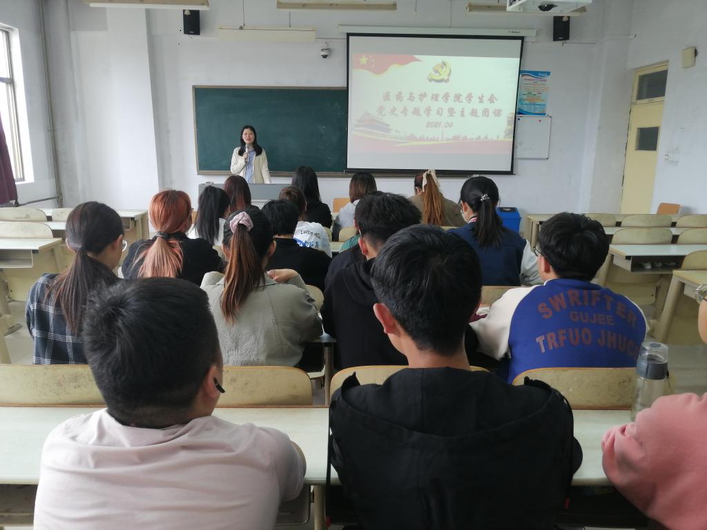2021年4月22日,医药与护理学院学生会工作人员于体育楼503教室开展党史学习暨主题团课,团总支书记主讲,辅导员老师、全体学生会工作人员参加。