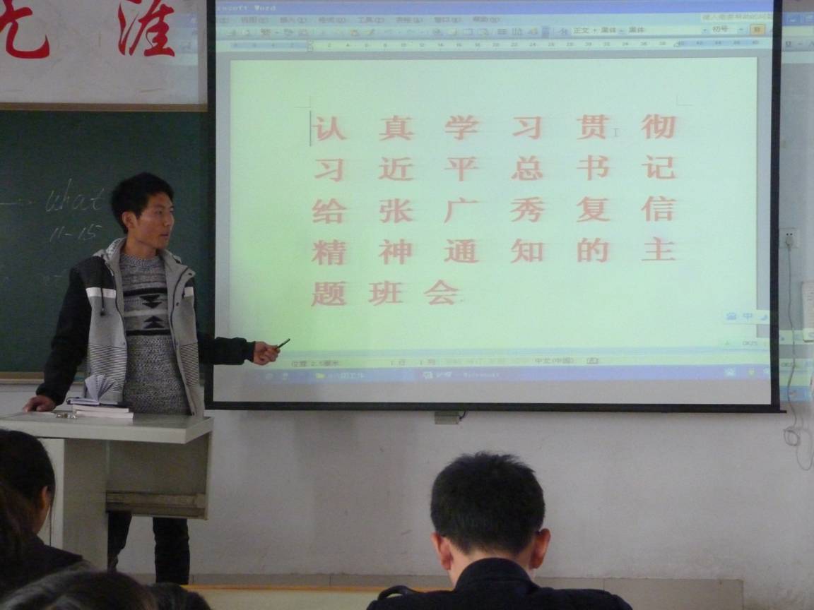 在这次班会上,主讲员讲到习近平总书记给村官张广秀回信的事情。热切传达了习近平总书记希望大学生村官热爱基层、扎根基层,让大学生增长见识、增长才干,促农村发展,让农民受益,让自己青春无悔的精神。同时也讲到了张广秀这个大学生村官的感人事迹。通过优秀典型的示范带动作用,引导广大团员青年特别是大学生牢记党的期望,树立到基层去、到祖国最需要的地方去建功立业的青春志向。
