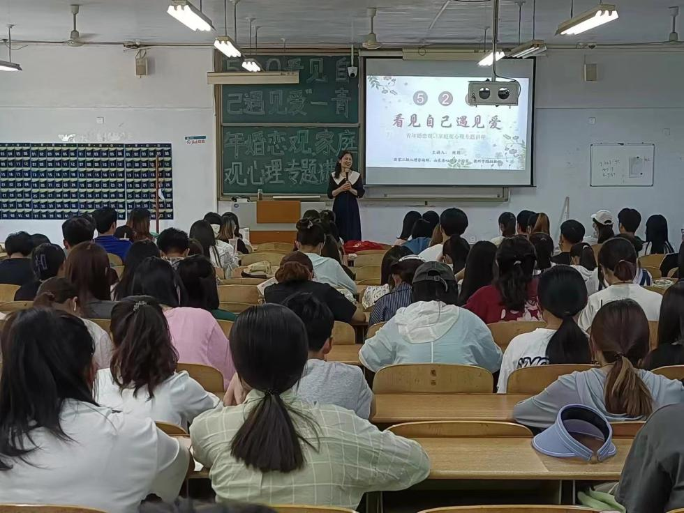 为认真贯彻落实《山东省教育厅关于举办2022年山东省学校心理健康教育月活动的通知》精神,引导同学们树立正确的婚恋观,普及健康的恋爱心理知识,5月20日下午,医药与护理学院于求实楼212教室举办“5.20,看见自己遇见爱”——青年婚恋观、家庭观心理专题讲座,本次讲座特邀医药与护理学院刘筠副教授主讲。