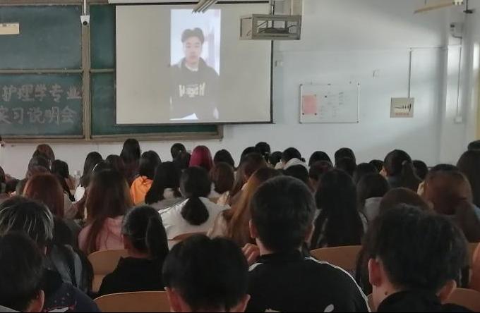 负责实习的老师对本年度护理实习基地(山东省立医院、山东省千佛山医院、烟台毓璜顶医院、德州市人民医院)做了简要介绍要求同学按时填报实习志愿班主任老师播放了往届实习学生对实习和就业的认知视频