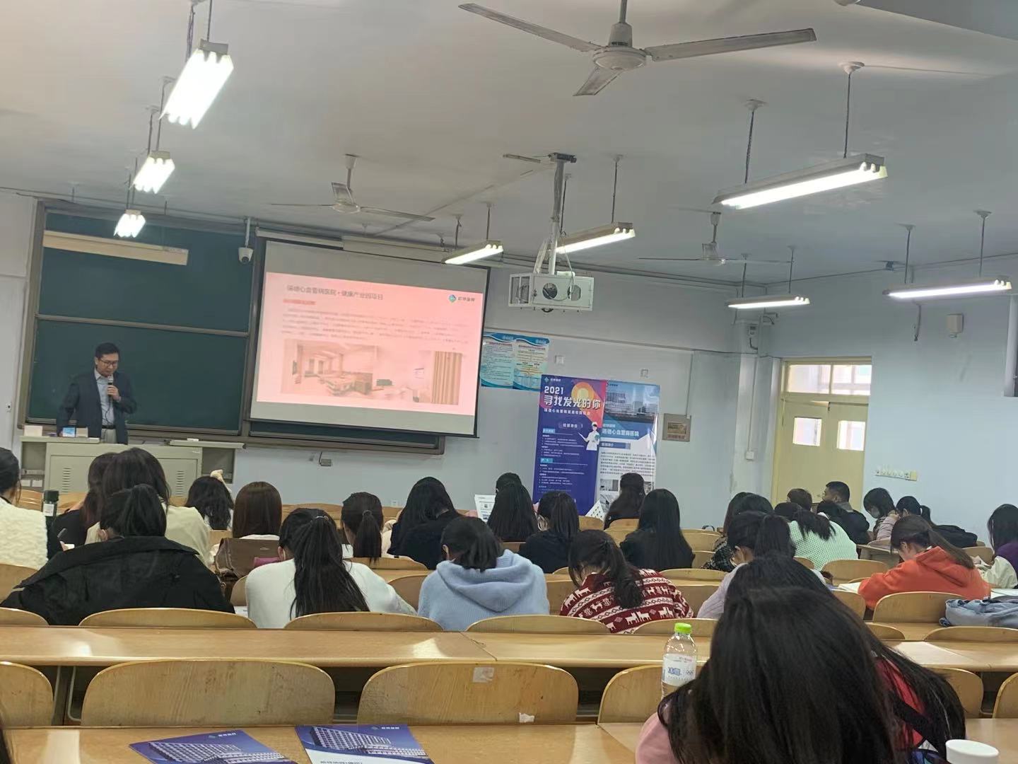 宣讲会上,主讲人详细介绍本公司的发展状况、项目规模、集团理念和强大的团队力量。并针对不同招聘岗位的任职资格、薪资待遇和工作环境等方面做了详细的讲解。此外,一位现任的护士长向学生宣讲自己从实习到护士长的经历,鼓励学生进行深造,在当今医疗严峻的形式下,社会对医务人员的要求也越来越全面,不仅要有较高的文凭,还需具备良好的综合素质,本次宣讲会在一片掌声中圆满结束。