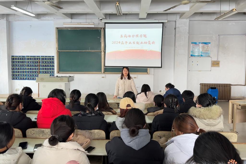 为全面推进学院2024届毕业生就业工作,引导毕业生树立正确的就业观念,提高就业积极性和主动性,12月15日,医药与护理学院在体育楼401教室召开2024届毕业生就业动员大会,学院党委副书记出席,分管就业辅导员、毕业年级辅导员及2024届毕业生参加会议。