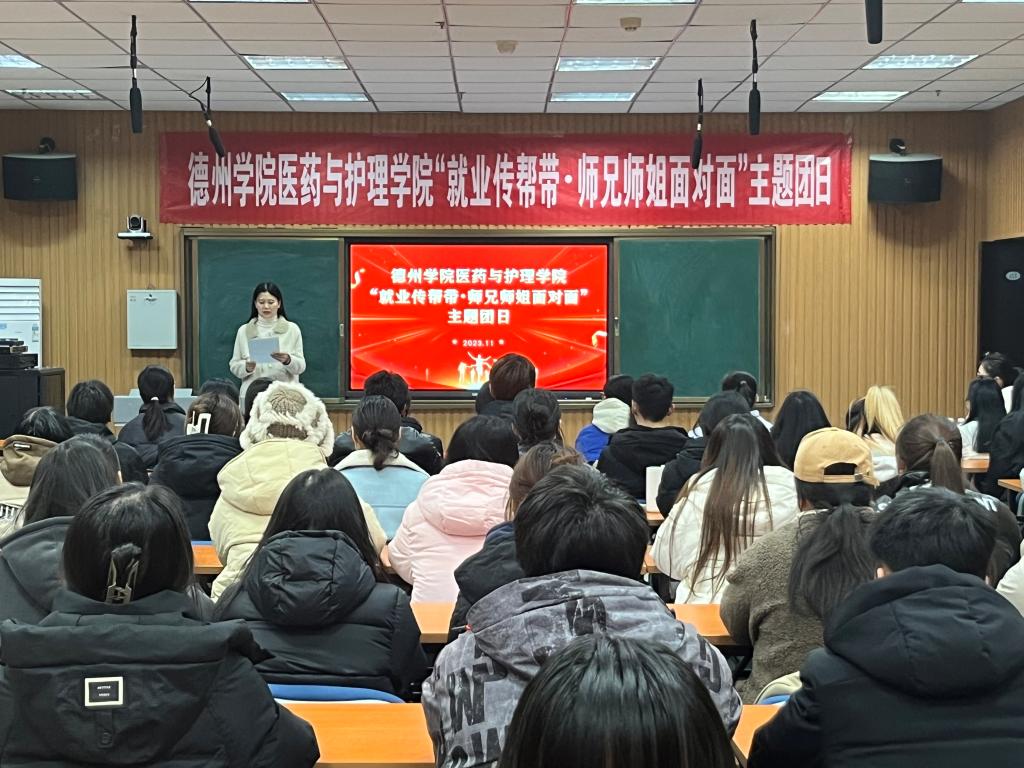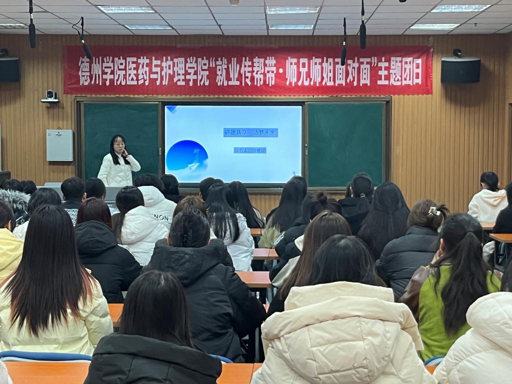 为进一步做好青年学生就业创业工作,进一步激发学生职业生涯规划意识,引导青年学生树立正确就业观、择业观,实现高质量就业,医药与护理学院团委于11月23日在厚德楼413录播室举办“就业传帮带·师兄师姐面对面——医护大学生职业生涯规划”为主题的主题团日活动。本次活动邀请了医药与护理学院优秀毕业生、校友代表2011级生物技术(生物制药方向)倪爱云和2012级护理学专业刘新新担任主讲嘉宾。活动由学院团委书记主持,相关专业200余名学生参加。