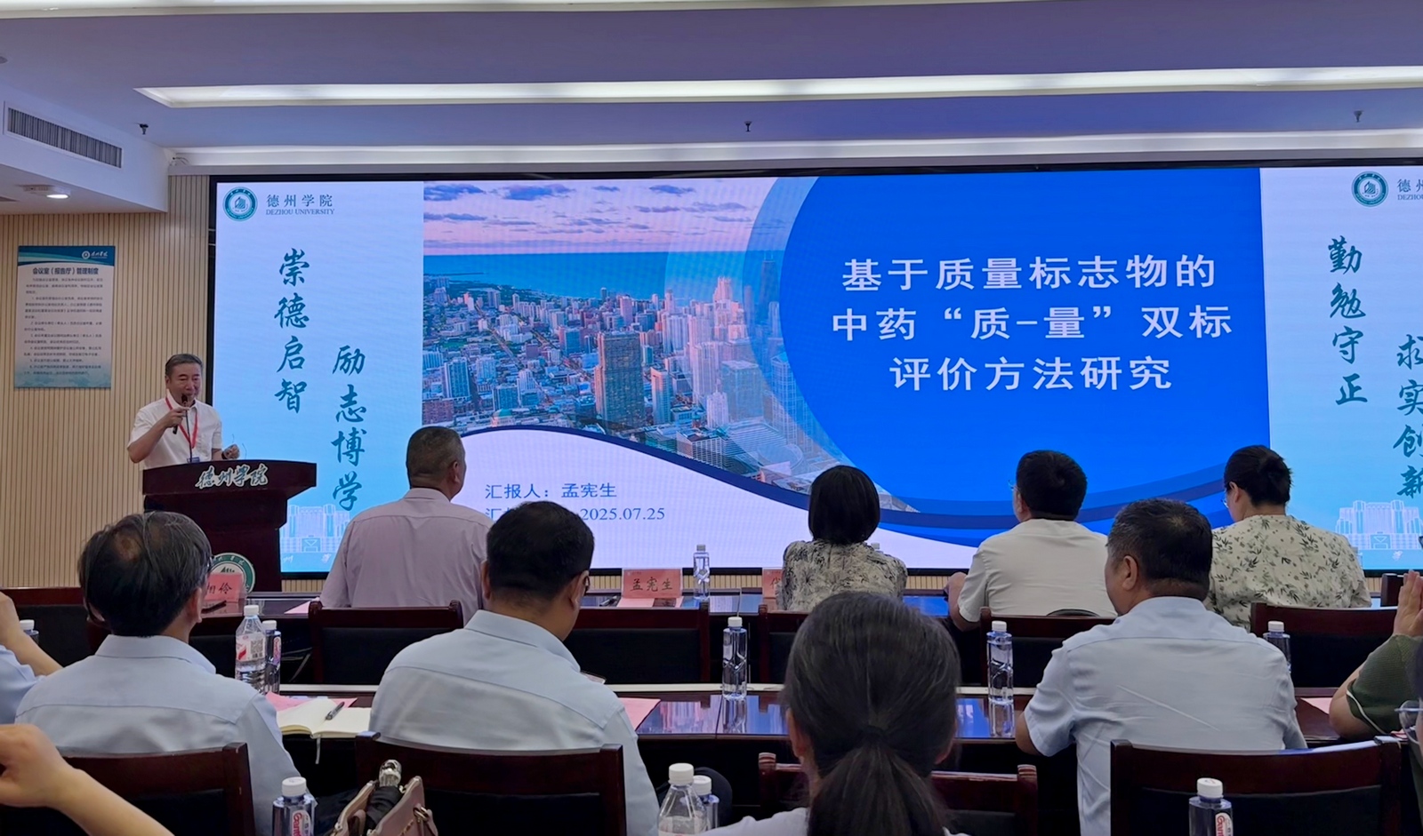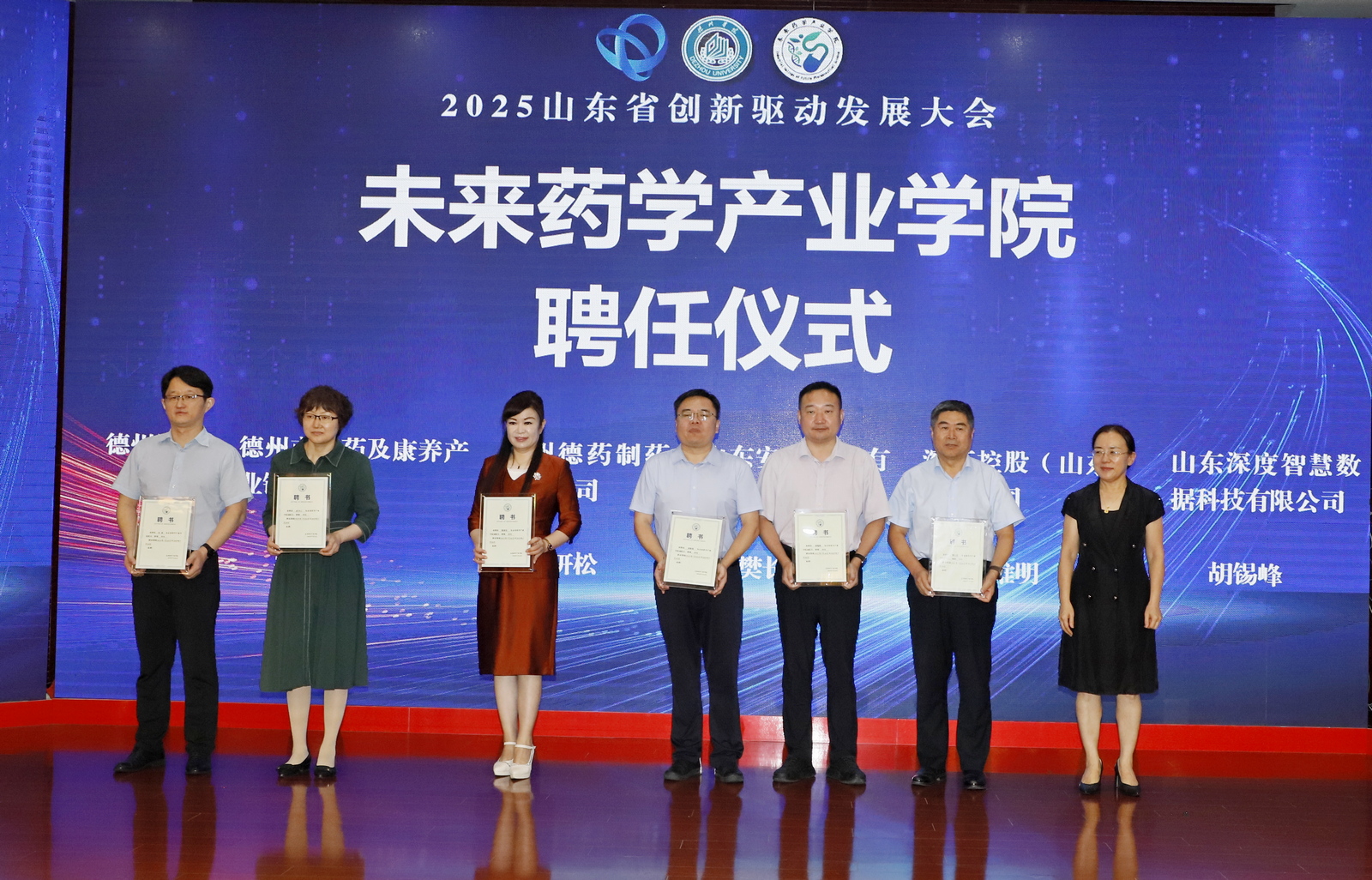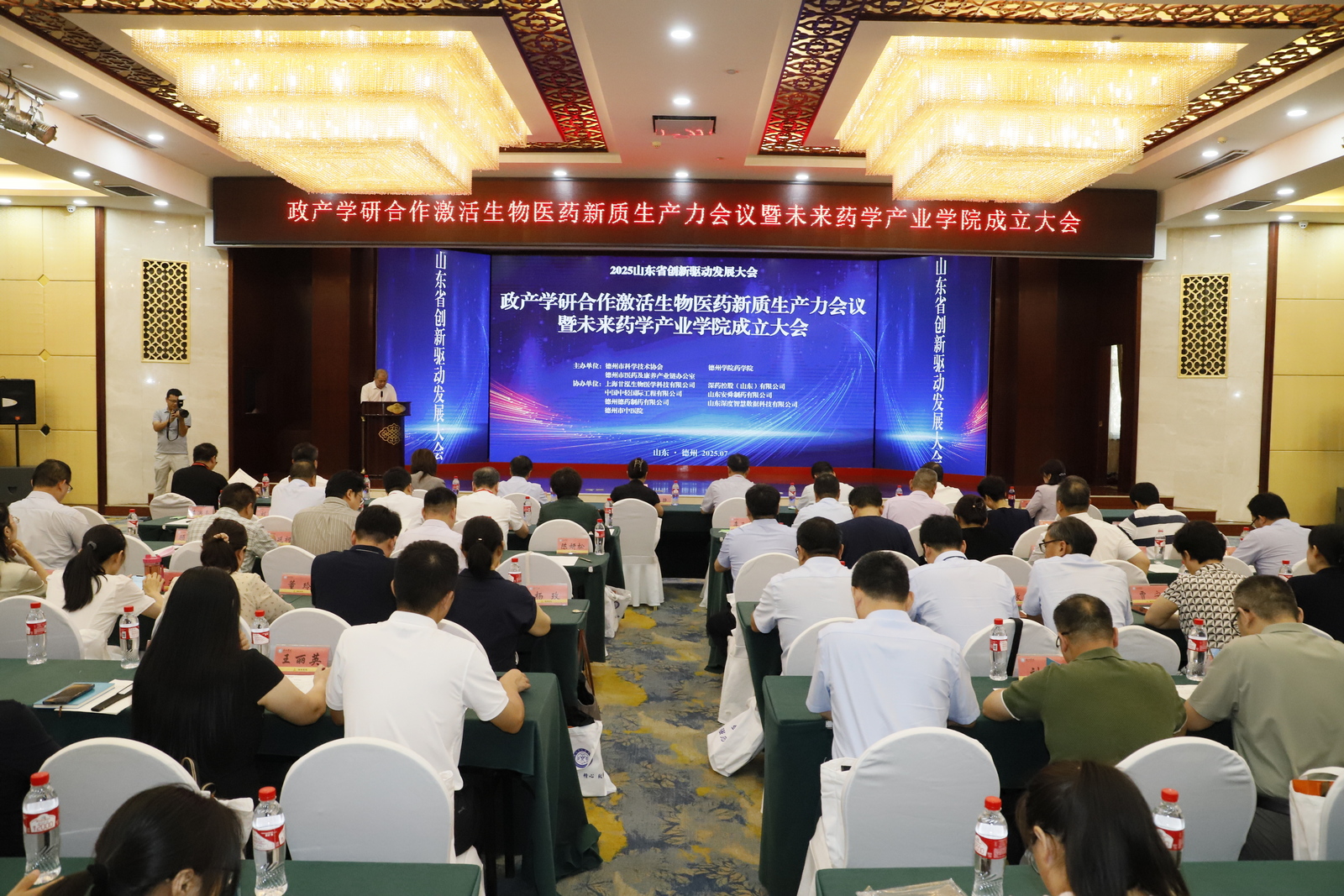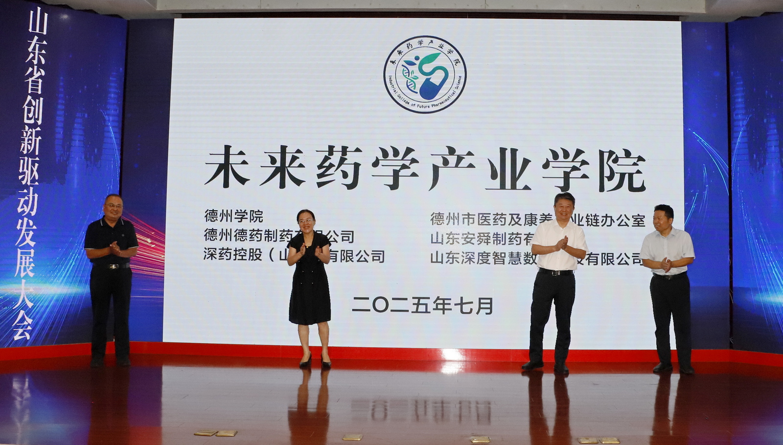 7月26日上午,政产学研合作激活生物医药新质生产力会议暨未来药学产业学院成立大会在德州市柳湖书院酒店举办。此次会议是2025山东省创新驱动发展大会系列活动之一,由德州市科学技术协会、英国正版365首页、德州市医药及康养产业链办公室联合主办,上海甘泓生物医学科技有限公司、深药控股(山东)有限公司等7家企事业单位协办。我校党委委员、副校长徐静,德州市科学技术协会、卫生健康委员会、发展和改革委员会相关职能部门负责人,来自清华大学、武汉大学等11所高校及研究院知名专家,德州市医养健康股份有限公司等7家企业代表及我校英国正版365首页全体师生百余人参加会议。