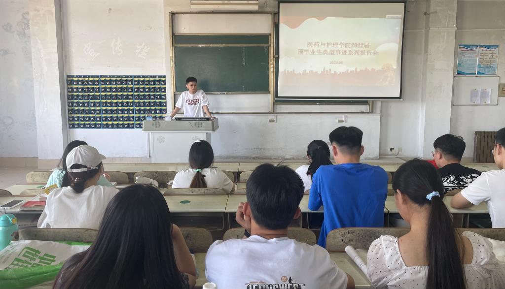 为传授毕业生的优秀学习经验,发挥优秀学生的朋辈引领作用,医药与护理学院于5月26日在体育楼401举办2022届优秀预毕业生典型事迹系列报告会,全体辅导员老师及2019级、2020级学生参加报告会。