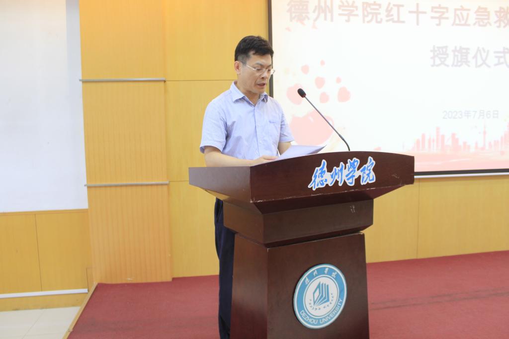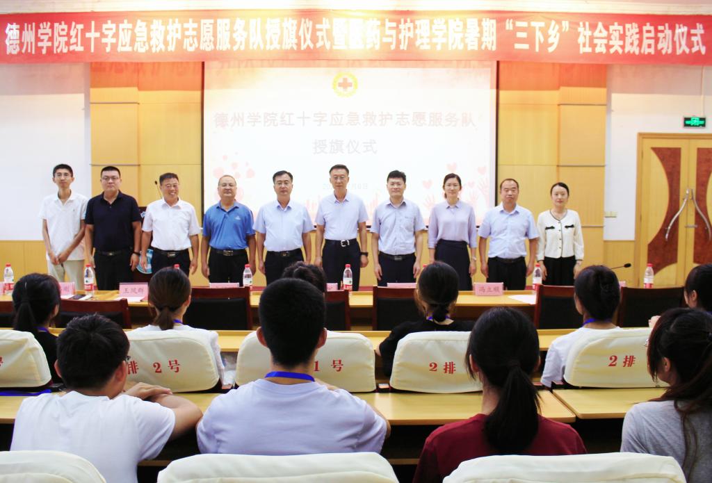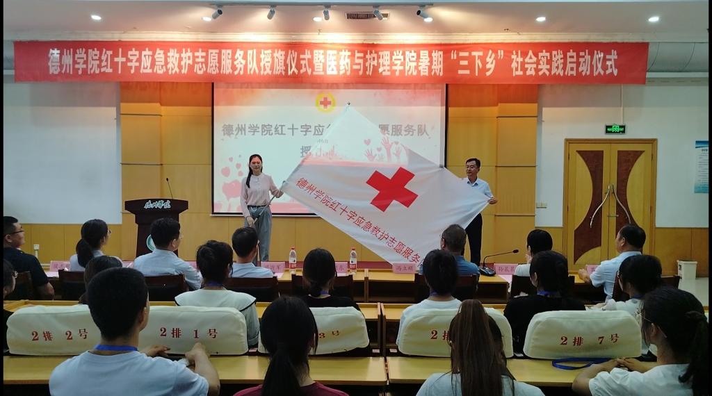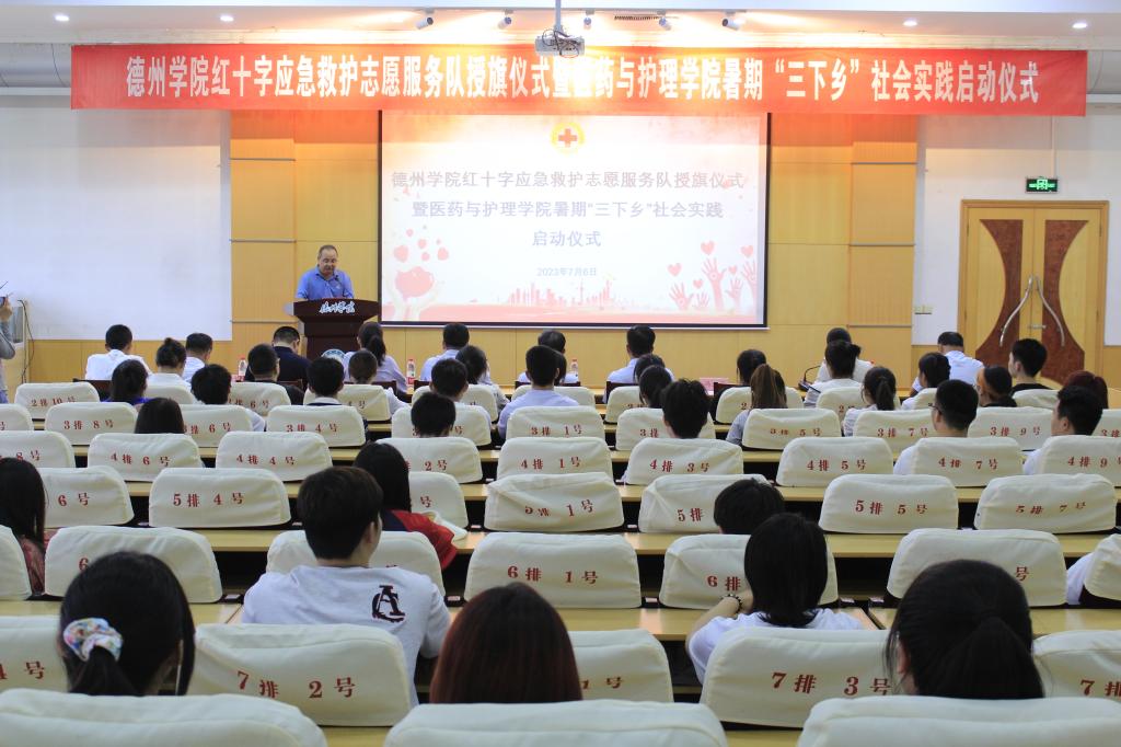 为弘扬“人道、博爱、奉献”的红十字精神和“奉献、友爱、互助、进步”的志愿服务精神,更好地推进暑期“三下乡”社会实践活动深入开展。7月6日下午,医药与护理学院于厚德楼四楼报告厅举办英国365集团公司红十字应急救护志愿服务队授旗仪式暨暑期“三下乡”社会实践启动仪式。英国365集团公司党委委员、副校长迟沂军、德州市红十字会常务副会长李福辉、德州市红十字会党组成员、副会长黄卫东、英国365集团公司团委书记王凤群出席,医药与护理学院相关负责人、市红十字会应急救护培训中心相关负责人及学生志愿者共百余人参加。