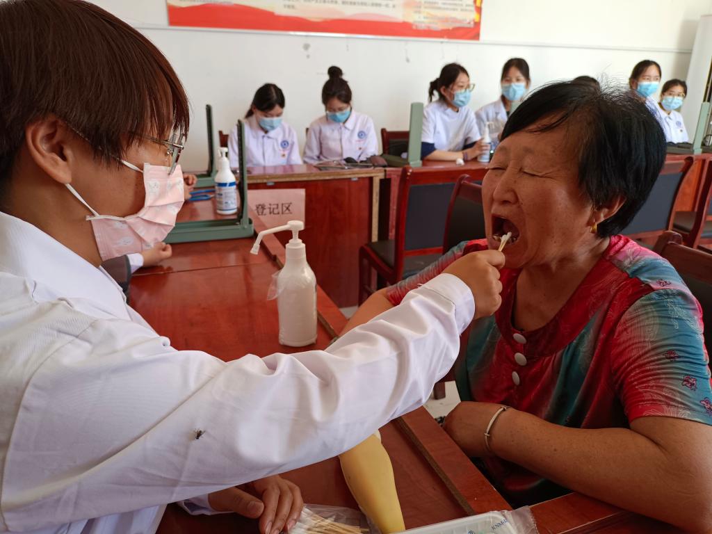 义诊现场,志愿者设置了血压测量和口腔检查等服务咨询点,为村民百姓民现场量血压、检查口腔等,耐心解疑答惑、测量健康指标,提出日常预防、保健方案及治疗建议,对村民进行健康监测,加强村民对疾病和慢性病的认识和防范,同时提升护理、口腔等专业学生的理论实操技能。