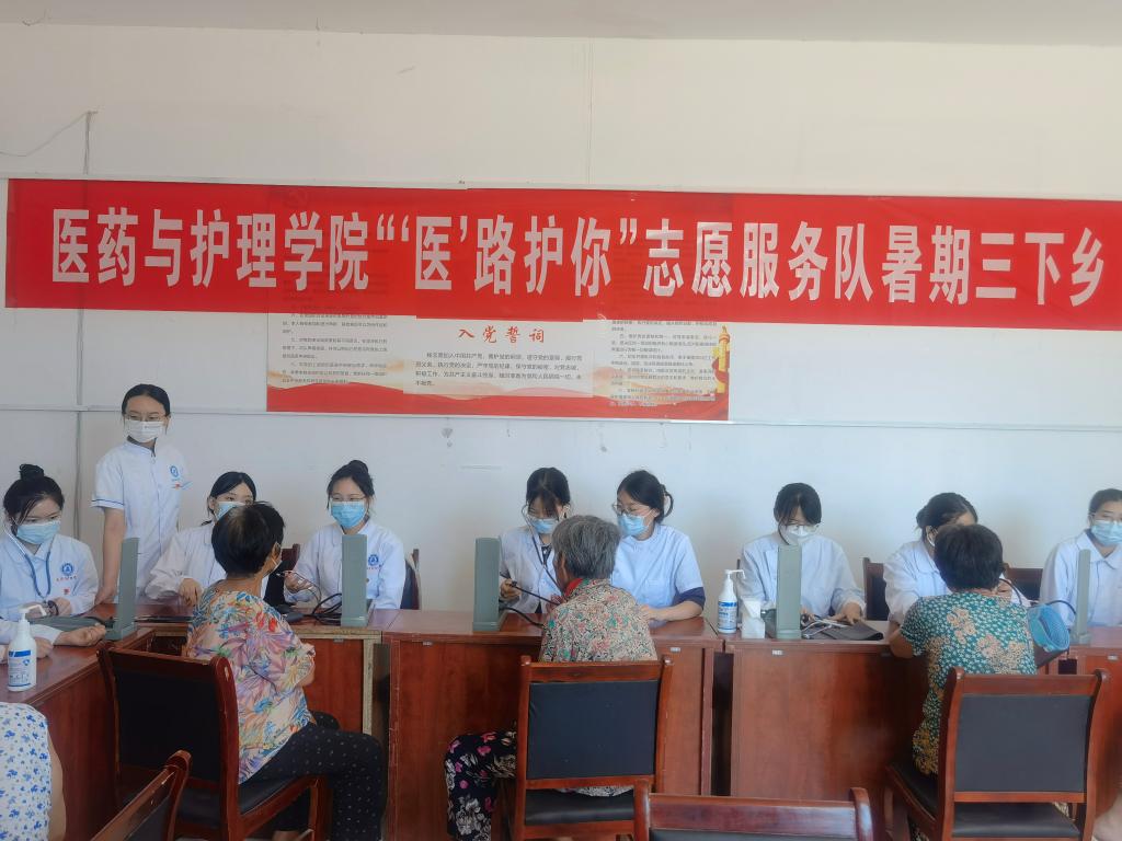 为贯彻落实习近平总书记在中国人民大学考察时的重要讲话精神,引领教育广大青年学生立足新时代新征程,牢记“用脚步丈量祖国大地,用眼睛发现中国精神,用耳朵倾听人民呼声,用内心感应时代脉搏”的殷切嘱托,坚定信念听党话、跟党走,迎接党的二十大胜利召开。2022年6月24日,医药与护理学院围绕健康中国战略和学院专业实际,由师生党员、南丁格尔志愿者、学生干部等共五十余人,组建“‘医’路护你”志愿服务队、“馨星助梦”志愿服务队、医养健康教育宣讲队赴宁津县长官镇、杜集镇等地区开展暑期“三下乡”社会实践活动。