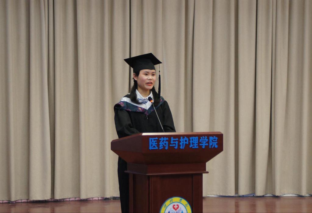 在校生代表2019级生物制药专业杜金洋表示,将以学长学姐为榜样,接过他们手中的接力棒,成为困难面前的“排头兵”,危难时的“领头羊”,努力拼搏,学有所成。