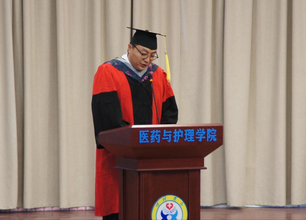 毕业典礼上,院长顾相伶致辞。他首先对2022届毕业生顺利毕业表示祝贺和祝福,向为学生成长成才辛勤付出的老师、家长,致以崇高的敬意和衷心的感谢。他说,曾经你们怯怯地向老师提问问题的情景还历历在目,转眼间你们将成为各行各业的中坚力量。在你们的青春时光里,医药与护理学院成就了你,同时我们也企盼着,有一天医药与护理学院也因你而荣耀。