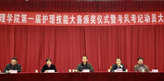 会上对本次护理技能大赛活动进行了介绍并宣布获奖名单,对获奖选手进行颁奖。同时进行考风考纪动员,通报上一年度学生学业情况,党总支书记阐述学校考风考纪的相关纪律,并对同学们提出要求和希望,在学生代表王东博带领下全体学生集体宣誓,承诺遵守考场纪律,诚信考试。最后院负责人要求加强医药与护理学院的教风和学风的建设,也预祝同学们在即将到来的期末考试中取得佳绩。