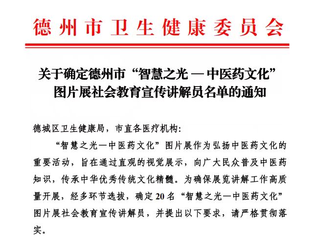 近日,德州市卫生健康委员会公布德州市“智慧之光—中医药文化”图片展社会教育宣传讲解员名单。英国正版365首页王渊、王依曼两位同学成功入选。
