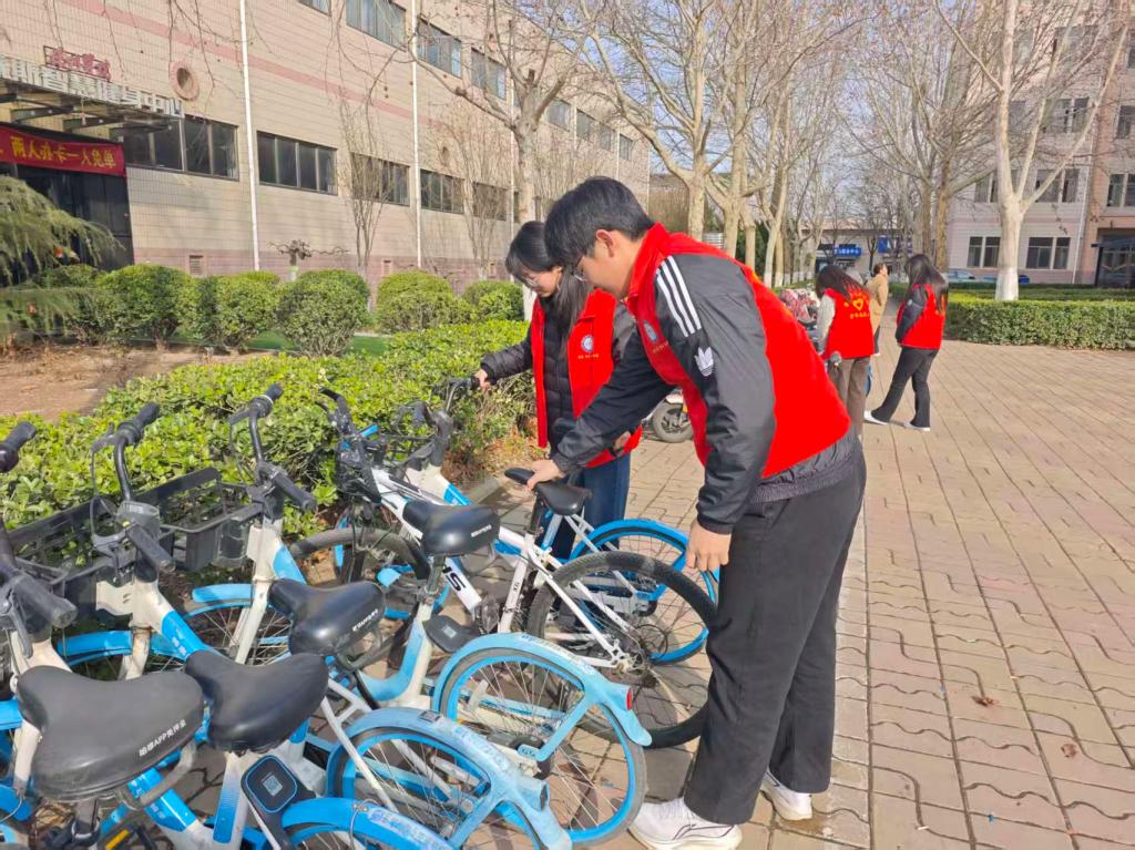 志愿者们身着统一志愿服装,分组奔赴校园主干道、绿化带、操场周边及共享电单车停放区,有序开展环境整治工作。大家手持扫帚、夹子、垃圾袋等工具,俯身细致清理纸屑、塑料瓶、烟蒂等生活垃圾,逐一排查卫生死角、捡拾隐蔽杂物,耐心擦拭清扫顽固污渍;针对共享电单车乱停乱放问题,志愿者两两配合,按照校园停放规范逐一扶正车辆、规整摆放,让杂乱的停放区快速恢复整洁有序。全体成员分工明确、配合默契,不怕脏、不怕累,以饱满热情投入劳动。不少路过师生深受感染,主动拿起工具加入清理队伍,形成全员携手共建文明校园的浓厚氛围。