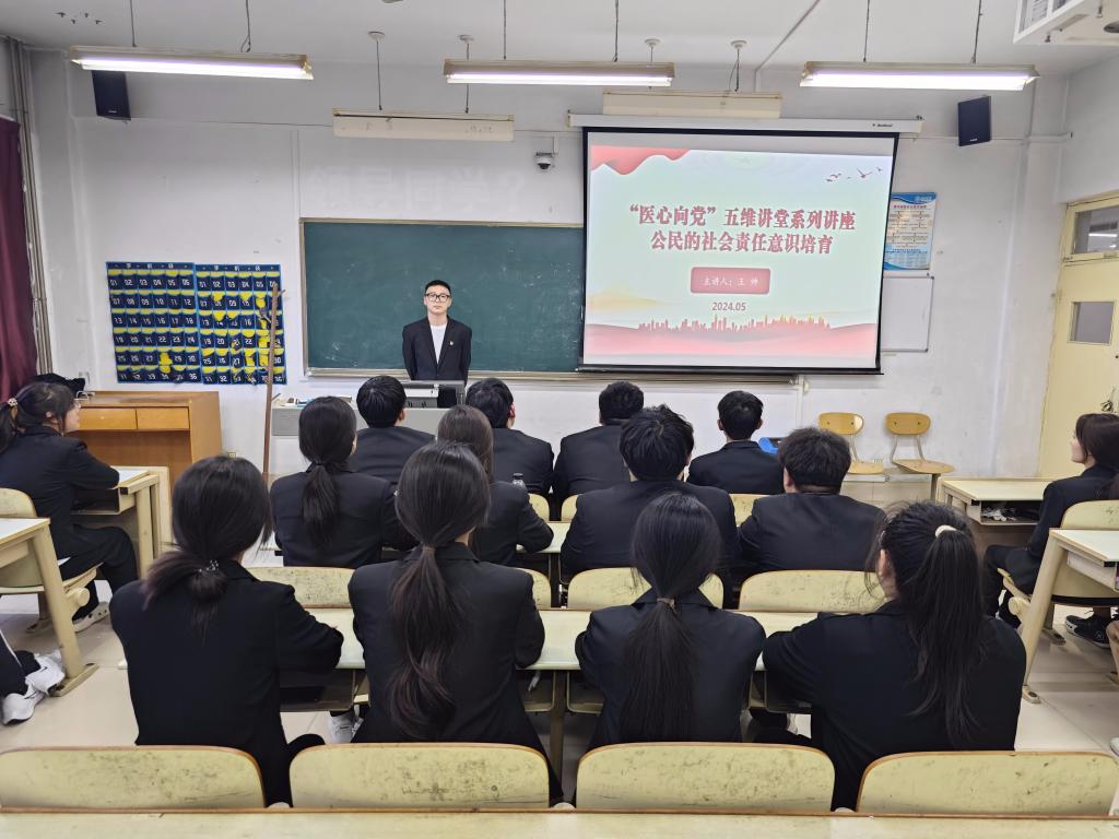 为贯彻落实习近平新时代中国特色社会主义思想,推进社会主义核心价值体系建设,构建和谐美丽社会,2024年5月7日,医药与护理学院开展“医心向党”五维讲堂系列讲座之公民社会责任意识的培育专题讲座。学生党员代表王帅同志主讲,第一学生党支部全体党员参加。