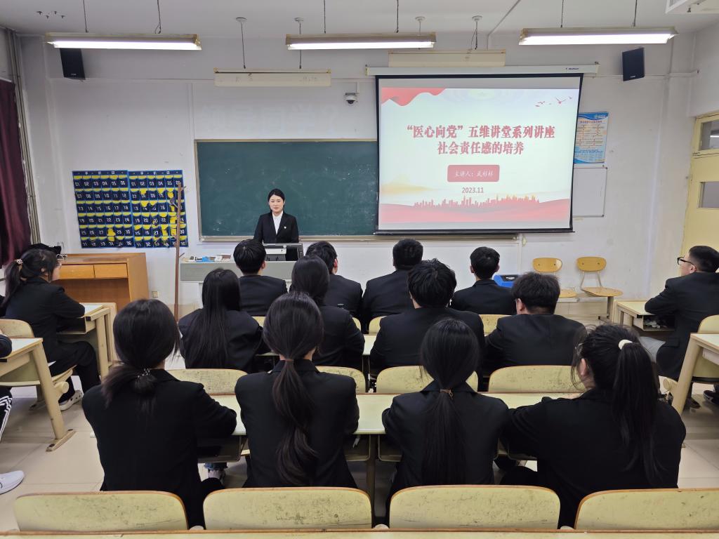 为贯彻落实习近平总书记关于社会主义核心价值观的重要论述,增进公众对社会责任的认识和理解,2023年11月14日,医药与护理学院开展了“医心向党”五维讲堂系列讲座之社会责任感的培养的专题讲座。学生党员代表武杉杉同志主讲,第一学生党支部全体党员参加。