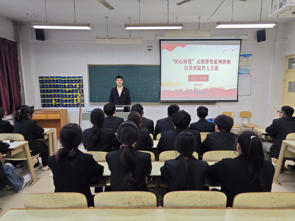 为深入贯彻习近平总书记关于文化教育和美育工作的重要指示精神,提升广大青年党员的人文素养,医药与护理学院于2023年7月4日开展了“医心向党”五维讲堂系列讲座之以美育提升人文素主题讲座。学生党员代表马均衡主讲,第一学生党支部全体党员参加。