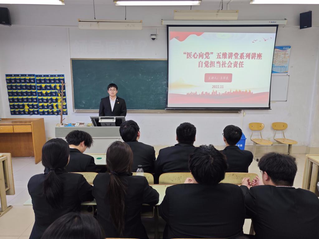 为引导学生党员深入思考社会责任的重要性,激发大家将理念转化为实际行动。医药与护理学院第一学生党支部于2022年11月15日开展了“医心向党”五维讲堂系列讲座之自觉担当社会责任主题讲座,讲座由学生党员代表王怀良主讲,第一学生党支部全体党员参加。