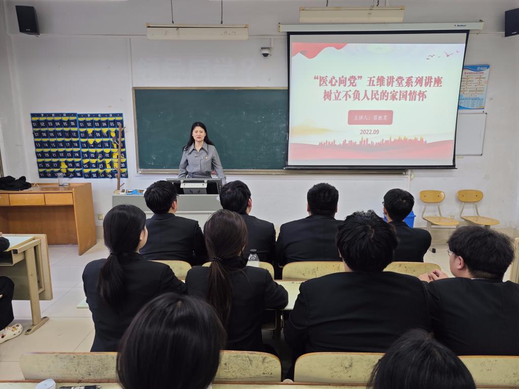 为深入贯彻习近平总书记“树立不负人民的家国情怀,追求高尚纯粹的思想境界,为党和人民事业拼搏奉献”的精神。2022年9月20日,医药与护理学院第一学生党支部开展“医心向党”五维讲堂系列讲座之不负人民国家情怀主题讲座,支部书记蔡胜男主持,第一学生党支部全体党员参加。