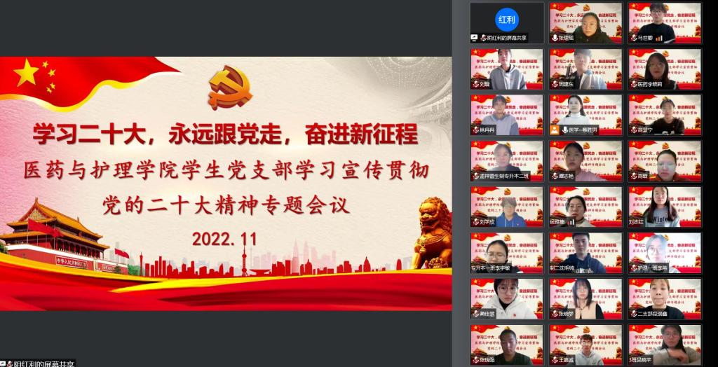 1115日,医药与护理学院第一学生党支部和第二学生党支部召开线上主题党日活动,学习宣传贯彻党的二十大精神,会议由支部书记主持。