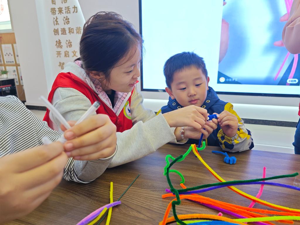 活动伊始,志愿者以PPT的形式详细讲解扭扭棒花束手工制作的方法,调动孩子们参与活动的积极性。随后,志愿者为大家示范正确的操作步骤,孩子们边听边做,互帮互助、相互学习。志愿者们手把手耐心指导孩子们进行制作,现场气氛十分活跃。经过剪、卷、捏、粘等诸多工序后,一朵朵盛开的花朵跃然掌中。每个小朋友都出色地完成了自己的作品并纷纷展示出自己的劳动成果。此次活动充分展现出孩子们的创造精神、形象思维和逻辑思维的充分交融。