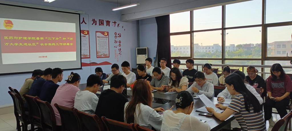 为引领广大青年学生深入学习贯彻习近平新时代中国特色社会主义思想,扎根中国大地,了解国情民情,在社会实践中坚定理想信念,激发奋斗精神。医药与护理学院于6月30日下午在体育楼508会议室召开暑期“三下乡”和“百万大学生进社区”社会实践工作部署会。会议由院团委书记蔡胜男老师主持,各班班长、团支书、学生会骨干参加。
