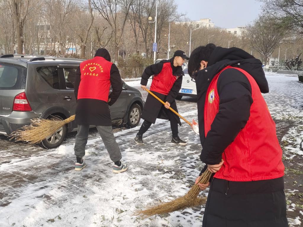 志愿者手握雪铲、扫帚在教学楼周围人流量较大、非机动车道、绿化带、桥面等积雪较多、路面湿滑的区域进行了及时清理,保障了师生出行安全,为文明、安全、和谐校园贡献了青春力量。活动过程中,志愿者们铲雪、搬运、清扫分工明确、默契配合,忙碌的身影在飘雪的冬日寒风中构成了一道亮丽的风景线。