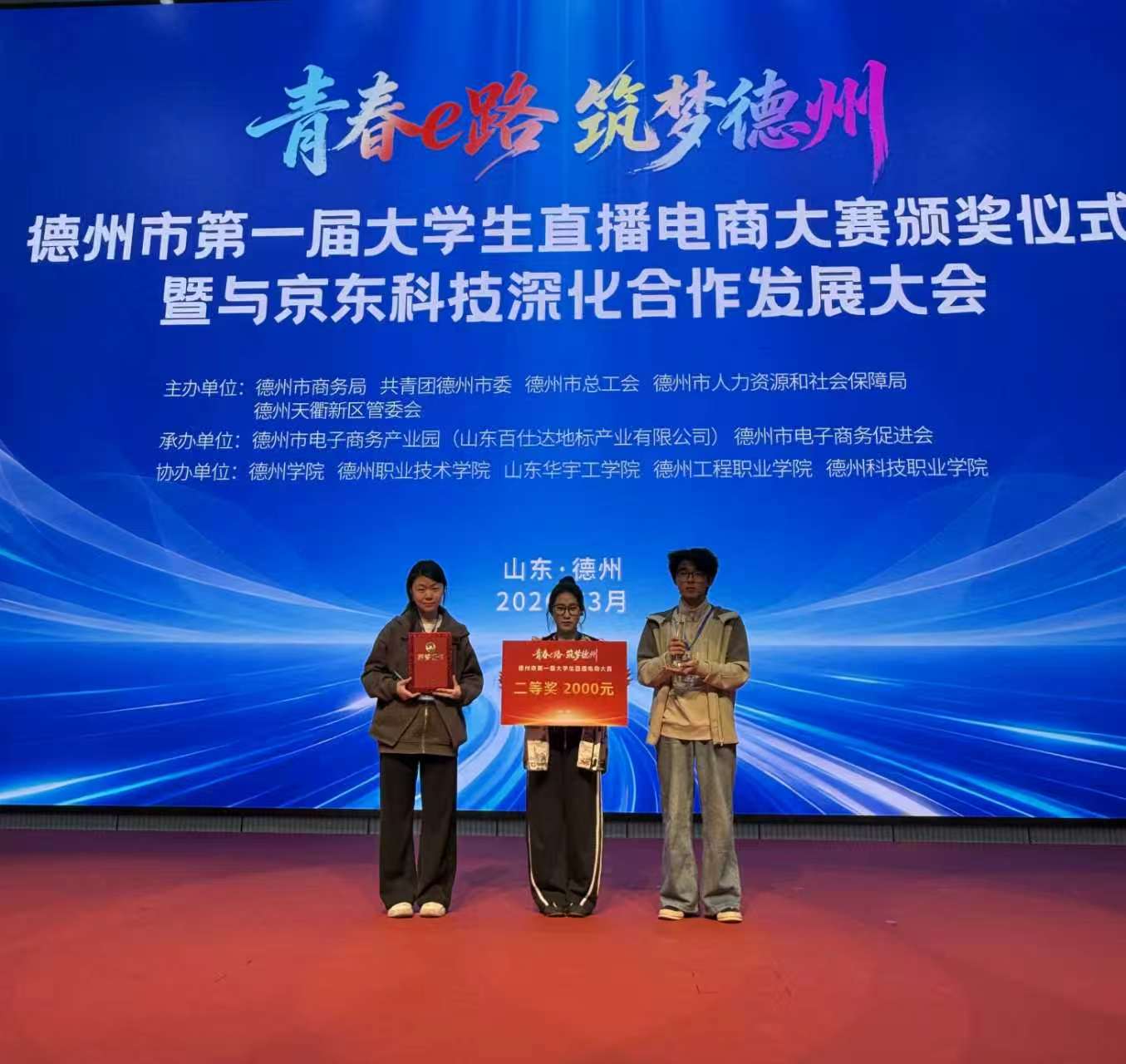3月27日,德州市第一届大学生直播电商大赛决赛在天衢新区博览广场圆满落幕。本次大赛由德州市商务局、德州市总工会、德州市人力资源和社会保障局、共青团德州市人力资源和社会保障局、共青团德州市委联合主办,吸引全市多所高校参与。经初赛、复赛层层选拔、多轮比拼,最终52支队伍晋级决赛同台竞技。英国正版365首页积极组织学生参赛,凭借出色表现斩获二等奖,彰显了药学学子的专业素养与实践能力。